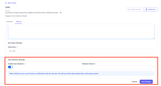 On the LiteLLM UI, Navigate to the Keys page. Select the key you want to update and click on Edit Settings > Auto-Rotation Settings